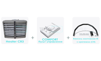 Готовый комплект для монтажа и эксплуатации: тепловентилятор CR3 в комплекте с консолью (кронштейном) и с пультом управления. Один пульт может управлять до 2-х шт. тепловентиляторов CR3 (больше 2-х нельзя подключать, сгорит пульт и двигатель тепловентилятора).