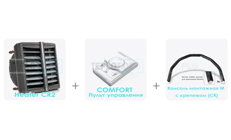 Готовый комплект для монтажа и эксплуатации: тепловентилятор CR2 в комплекте с консолью (кронштейном) и с пультом управления. Один пульт может управлять до 2-х шт. тепловентиляторов CR2 (больше 2-х нельзя подключать, сгорит пульт и двигатель тепловентилятора).
